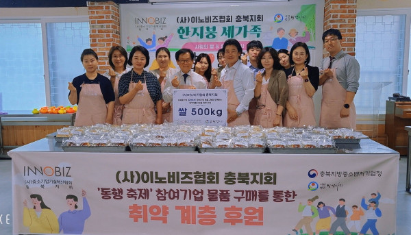 ㈔이노비즈 협회 충북지회(회장 임형택)는 4일 사단법인 징검다리 행복 나눔터에서 지역 취약계층을 위한 쌀 500kg 와 '한지붕세가족 사랑의 빵' 후원 전달식을 진행했다.
